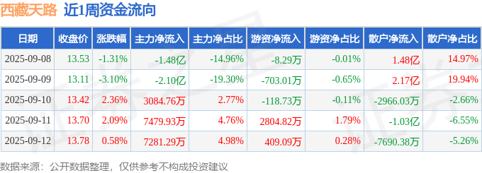 资金流向数据方面,本周西藏天路主力资金合计净流出1.79亿元,游资资金合计净流入2383.88万元,散户资金合计净流入1.55亿元。本周资金流向一览见下表: