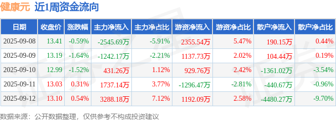 资金流向数据方面,本周健康元主力资金合计净流入1668.72万元,游资资金合计净流入4318.64万元,散户资金合计净流出5987.37万元。本周资金流向一览见下表: