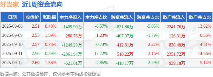 资金流向数据方面,本周好当家主力资金合计净流出5761.39万元,游资资金合计净流出734.08万元,散户资金合计净流入6495.46万元。本周资金流向一览见下表: