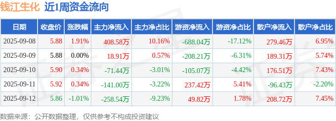 资金流向数据方面,本周钱江生化主力资金合计净流出43.49万元,游资资金合计净流出714.09万元,散户资金合计净流入757.58万元。本周资金流向一览见下表: