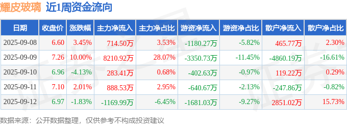资金流向数据方面,本周耀皮玻璃主力资金合计净流入8927.37万元,游资资金合计净流出7255.33万元,散户资金合计净流出1672.04万元。本周资金流向一览见下表: