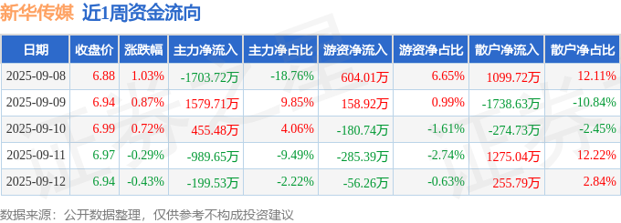 资金流向数据方面,本周新华传媒主力资金合计净流出857.71万元,游资资金合计净流入240.54万元,散户资金合计净流入617.18万元。本周资金流向一览见下表: