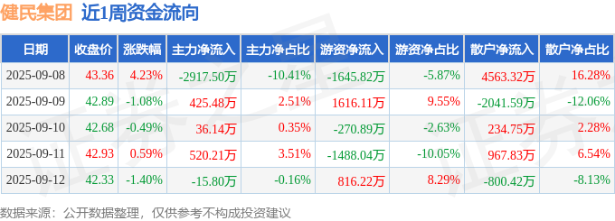 资金流向数据方面,本周健民集团主力资金合计净流出1951.47万元,游资资金合计净流出972.42万元,散户资金合计净流入2923.88万元。本周资金流向一览见下表: