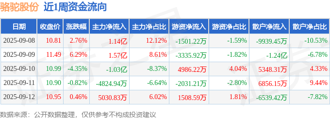 证券之星消息,截至2025年9月12日收盘,骆驼股份(601311)报收于10.95元,较上周的10.52元上涨4.09%。本周,骆驼股份9月9日盘中最高价报11.89元,股价触及近一年最高点。9月8日盘中最低价报10.35元。骆驼股份当前最新总市值128.46亿元,在电池板块市值排名43/95,在两市A股市值排名1489/5153。