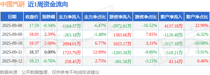 资金流向数据方面,本周中国汽研主力资金合计净流入2648.7万元,游资资金合计净流出2073.14万元,散户资金合计净流出575.55万元。本周资金流向一览见下表: