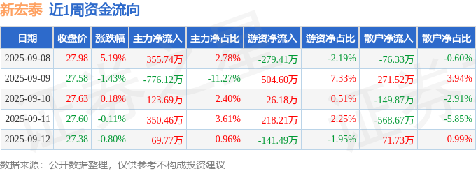 资金流向数据方面,本周新宏泰主力资金合计净流入123.55万元,游资资金合计净流入328.08万元,散户资金合计净流出451.63万元。本周资金流向一览见下表: