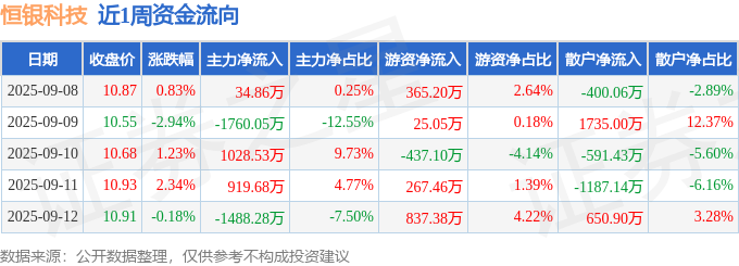 资金流向数据方面,本周恒银科技主力资金合计净流出1265.26万元,游资资金合计净流入1057.98万元,散户资金合计净流入207.28万元。本周资金流向一览见下表: