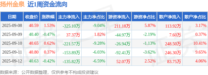 资金流向数据方面,本周扬州金泉主力资金合计净流出799.01万元,游资资金合计净流入98.94万元,散户资金合计净流入700.07万元。本周资金流向一览见下表: