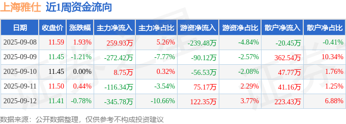 资金流向数据方面,本周上海雅仕主力资金合计净流出465.85万元,游资资金合计净流出188.6万元,散户资金合计净流入654.45万元。本周资金流向一览见下表: