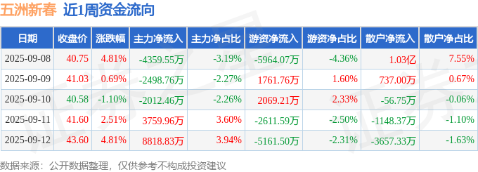 资金流向数据方面,本周五洲新春主力资金合计净流入3708.02万元,游资资金合计净流出9906.19万元,散户资金合计净流入6198.17万元。本周资金流向一览见下表: