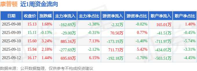 资金流向数据方面,本周康普顿主力资金合计净流入1111.47万元,游资资金合计净流入414.55万元,散户资金合计净流出1526.03万元。本周资金流向一览见下表: