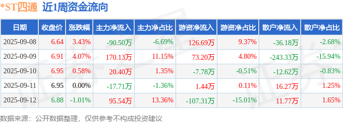 资金流向数据方面,本周*ST四通主力资金合计净流入177.85万元,游资资金合计净流入86.24万元,散户资金合计净流出264.09万元。本周资金流向一览见下表: