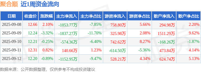资金流向数据方面,本周聚合顺主力资金合计净流出4477.69万元,游资资金合计净流入1741.11万元,散户资金合计净流入2736.58万元。本周资金流向一览见下表: