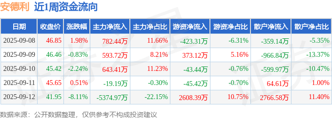 资金流向数据方面,本周安德利主力资金合计净流出3374.58万元,游资资金合计净流入2469.34万元,散户资金合计净流入905.24万元。本周资金流向一览见下表: