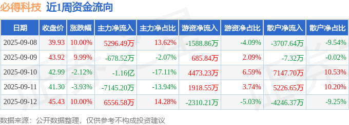 资金流向数据方面,本周必得科技主力资金合计净流出7591.57万元,游资资金合计净流入3178.56万元,散户资金合计净流入4413.01万元。本周资金流向一览见下表:
