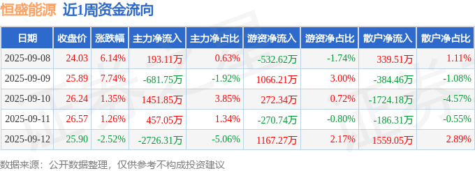 资金流向数据方面,本周恒盛能源主力资金合计净流出1306.06万元,游资资金合计净流入1702.45万元,散户资金合计净流出396.4万元。本周资金流向一览见下表: