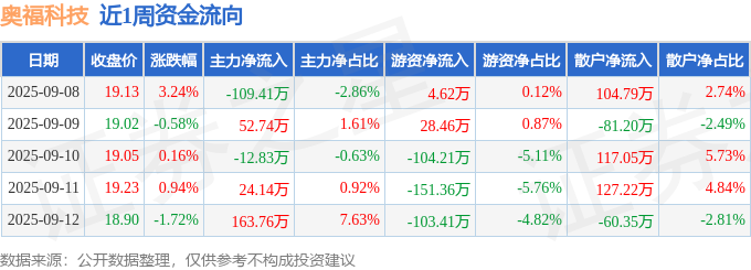 资金流向数据方面,本周奥福科技主力资金合计净流入118.4万元,游资资金合计净流出325.9万元,散户资金合计净流入207.5万元。本周资金流向一览见下表: