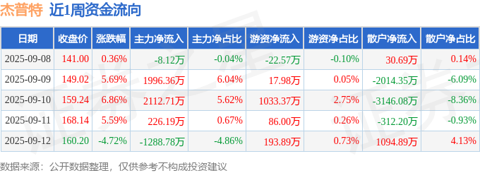 资金流向数据方面,本周杰普特主力资金合计净流入3038.37万元,游资资金合计净流入1308.67万元,散户资金合计净流出4347.04万元。本周资金流向一览见下表: