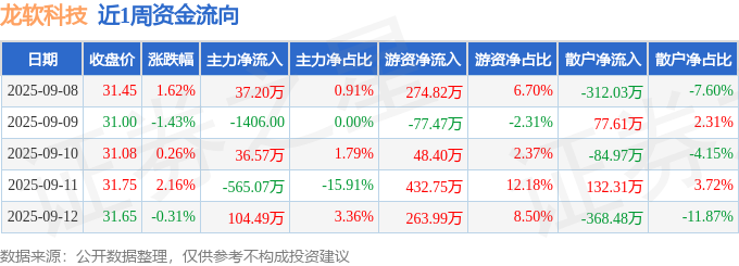 资金流向数据方面,本周龙软科技主力资金合计净流出386.95万元,游资资金合计净流入942.51万元,散户资金合计净流出555.56万元。本周资金流向一览见下表: