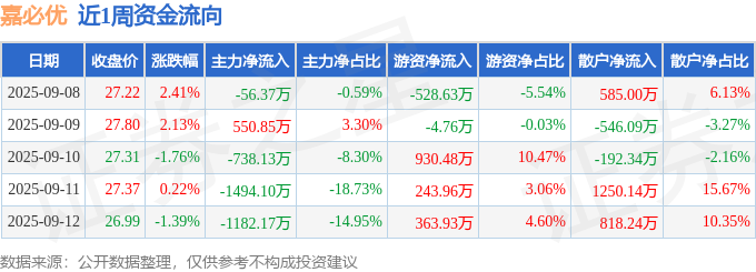 资金流向数据方面,本周嘉必优主力资金合计净流出2919.92万元,游资资金合计净流入1004.97万元,散户资金合计净流入1914.95万元。本周资金流向一览见下表: