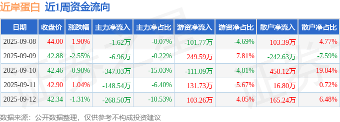 资金流向数据方面,本周近岸蛋白主力资金合计净流出772.65万元,游资资金合计净流入271.73万元,散户资金合计净流入500.92万元。本周资金流向一览见下表: