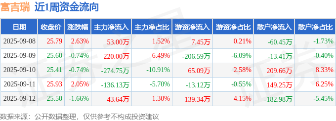 资金流向数据方面,本周富吉瑞主力资金合计净流出94.24万元,游资资金合计净流出7.83万元,散户资金合计净流入102.07万元。本周资金流向一览见下表: