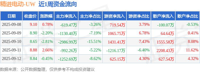 资金流向数据方面,本周精进电动主力资金合计净流出6981.81万元,游资资金合计净流入2625.68万元,散户资金合计净流入4356.13万元。本周资金流向一览见下表: