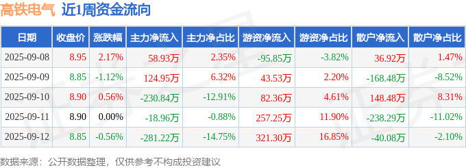 资金流向数据方面,本周高铁电气主力资金合计净流出347.14万元,游资资金合计净流入608.59万元,散户资金合计净流出261.45万元。本周资金流向一览见下表: