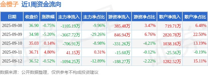 资金流向数据方面,本周金橙子主力资金合计净流出6532.91万元,游资资金合计净流入697.29万元,散户资金合计净流入5835.62万元。本周资金流向一览见下表: