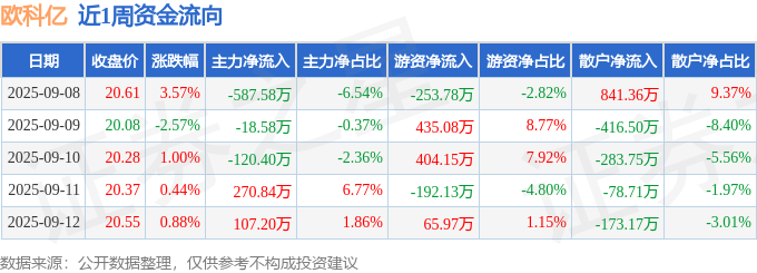 资金流向数据方面,本周欧科亿主力资金合计净流出348.52万元,游资资金合计净流入459.29万元,散户资金合计净流出110.77万元。本周资金流向一览见下表: