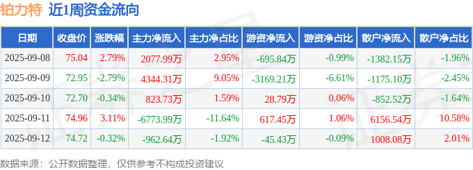 资金流向数据方面,本周铂力特主力资金合计净流出490.6万元,游资资金合计净流出3264.24万元,散户资金合计净流入3754.84万元。本周资金流向一览见下表: