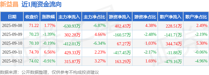 资金流向数据方面,本周新益昌主力资金合计净流入4.53万元,游资资金合计净流入54.97万元,散户资金合计净流出59.5万元。本周资金流向一览见下表: