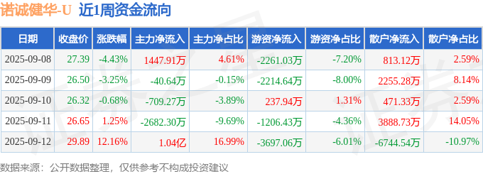 资金流向数据方面,本周诺诚健华主力资金合计净流入8457.29万元,游资资金合计净流出9141.22万元,散户资金合计净流入683.93万元。本周资金流向一览见下表: