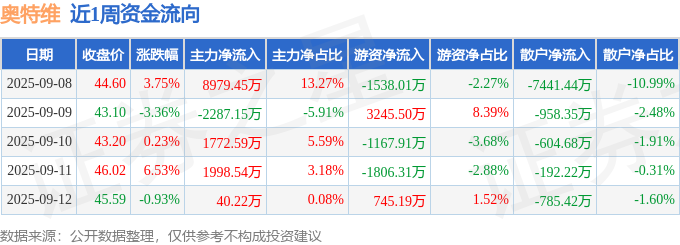 资金流向数据方面,本周奥特维主力资金合计净流入1.05亿元,游资资金合计净流出521.54万元,散户资金合计净流出9982.11万元。本周资金流向一览见下表: