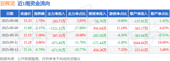 资金流向数据方面,本周亚辉龙主力资金合计净流出2365.66万元,游资资金合计净流入980.68万元,散户资金合计净流入1384.97万元。本周资金流向一览见下表: