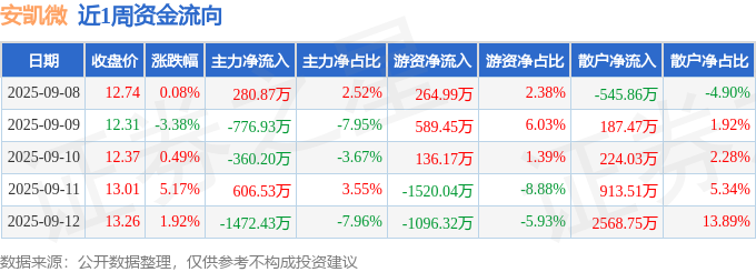资金流向数据方面,本周安凯微主力资金合计净流出1722.16万元,游资资金合计净流出1625.74万元,散户资金合计净流入3347.9万元。本周资金流向一览见下表: