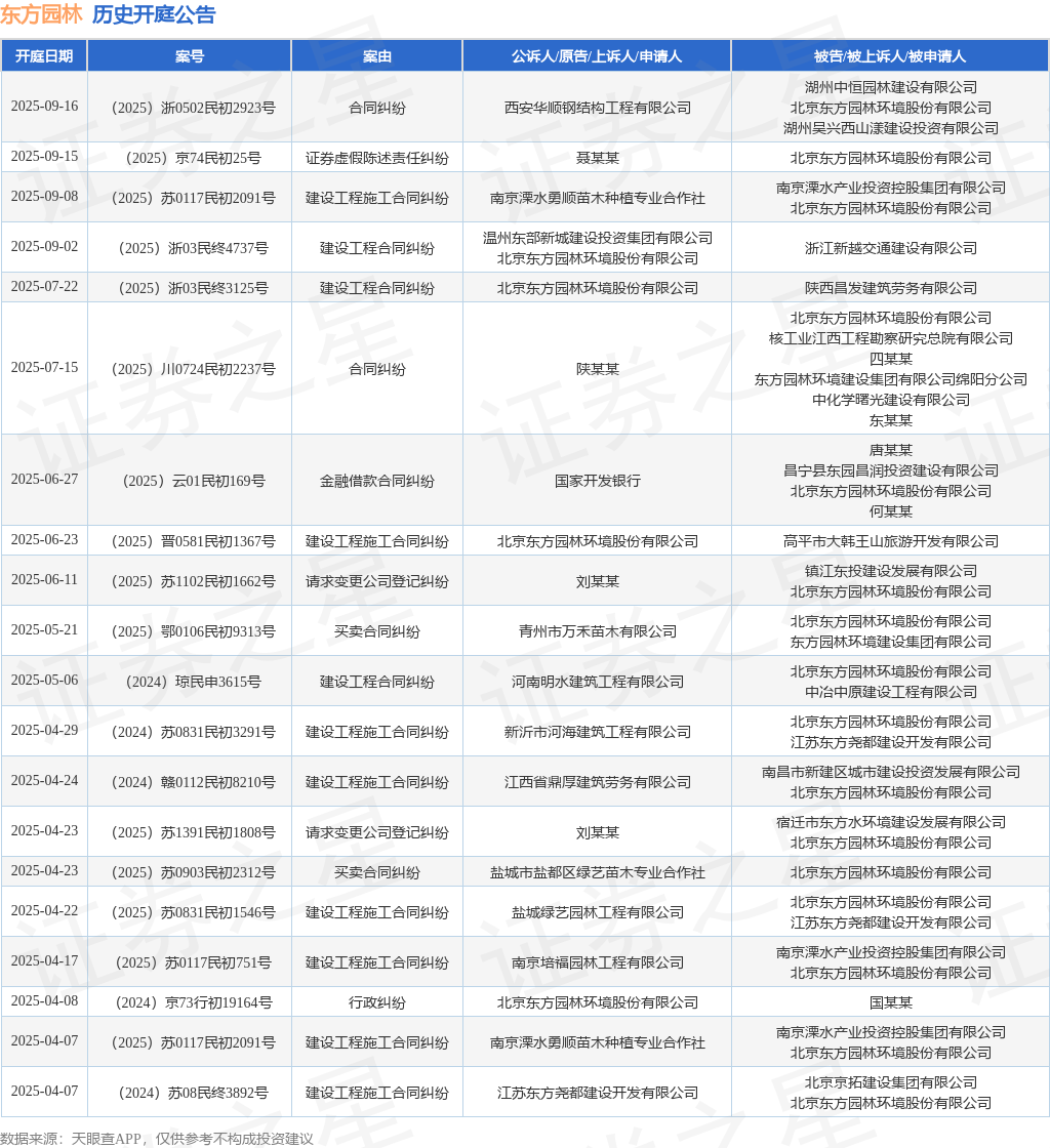 案号:(2025)浙0502民初2923号根据统计,近一年内以北京东方园林环境股份有限公司为当事人的历史开庭公告有96则,其中案由为“建设工程施工合同纠纷”的公告以50则居首,其次为“建设工程合同纠纷”有11则,“借款合同纠纷”有10则。历史开庭公告(前20条)如下:
