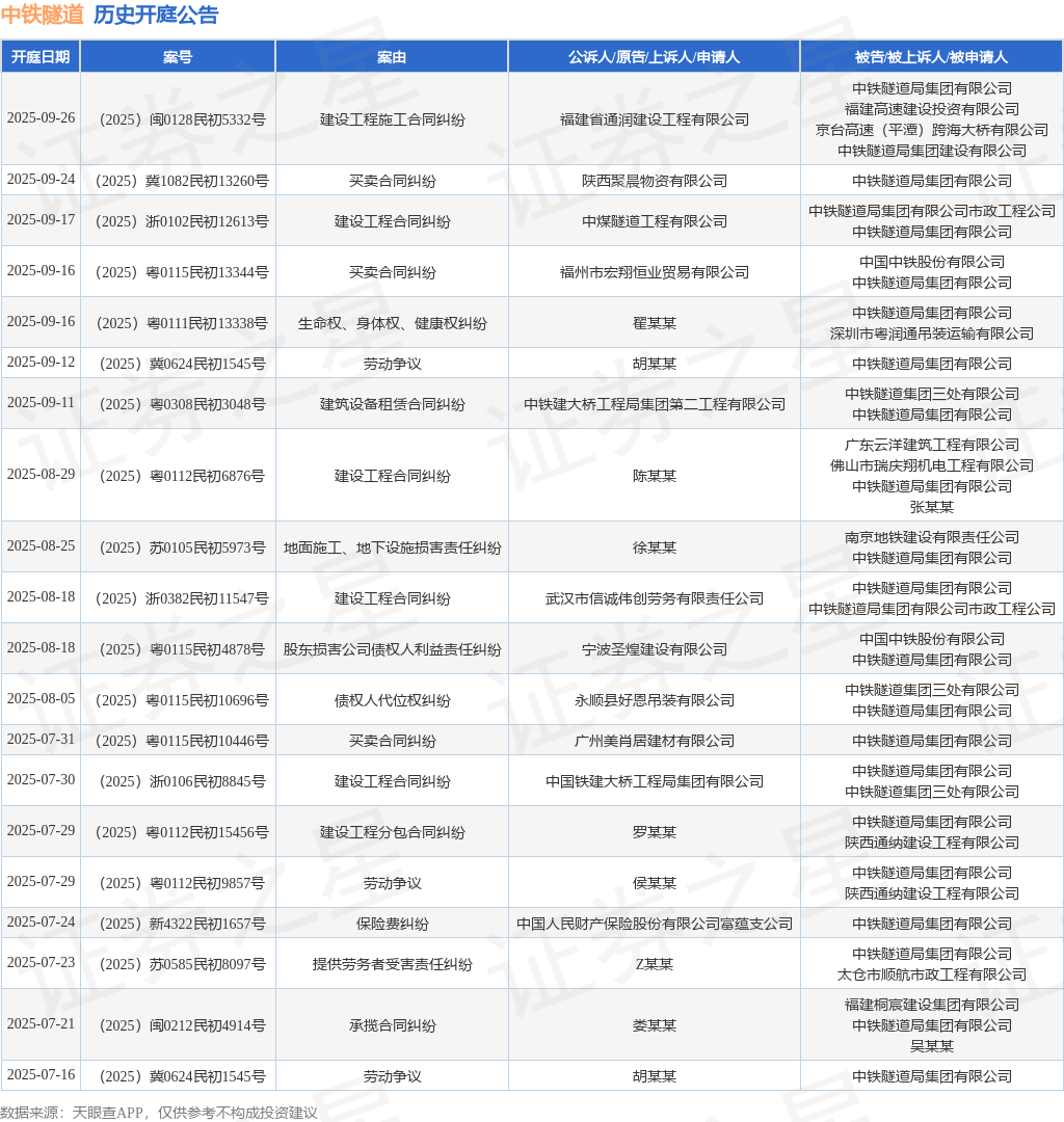 案号:(2025)粤0115民初13344号根据统计,近一年内以中铁隧道局集团有限公司为当事人的历史开庭公告有224则,其中案由为“买卖合同纠纷”的公告以36则居首,其次为“劳动争议”有21则,“建设工程分包合同纠纷”有19则。历史开庭公告(前20条)如下: