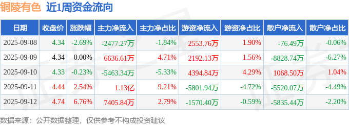 资金流向数据方面,本周铜陵有色主力资金合计净流入1.74亿元,游资资金合计净流入1768.39万元,散户资金合计净流出1.92亿元。本周资金流向一览见下表: