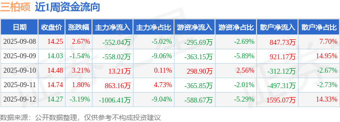 资金流向数据方面,本周三柏硕主力资金合计净流出1240.1万元,游资资金合计净流出1314.45万元,散户资金合计净流入2554.55万元。本周资金流向一览见下表: