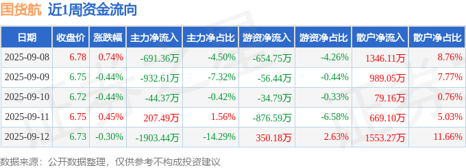 资金流向数据方面,本周国货航主力资金合计净流出3364.29万元,游资资金合计净流出1272.39万元,散户资金合计净流入4636.67万元。本周资金流向一览见下表: