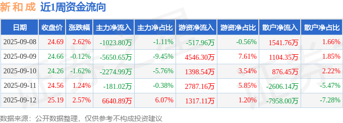 资金流向数据方面,本周新 和 成主力资金合计净流出2489.57万元,游资资金合计净流入9531.15万元,散户资金合计净流出7041.58万元。本周资金流向一览见下表: