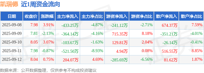 资金流向数据方面,本周凯瑞德主力资金合计净流出1218.5万元,游资资金合计净流入323.3万元,散户资金合计净流入895.2万元。本周资金流向一览见下表: