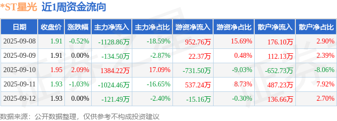 资金流向数据方面,本周*ST星光主力资金合计净流出1025.1万元,游资资金合计净流入765.71万元,散户资金合计净流入259.39万元。本周资金流向一览见下表: