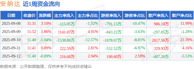 资金流向数据方面,本周安 纳 达主力资金合计净流出73.6万元,游资资金合计净流出3074.94万元,散户资金合计净流入3148.53万元。本周资金流向一览见下表: