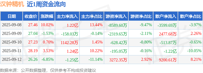资金流向数据方面,本周汉钟精机主力资金合计净流入1.31亿元,游资资金合计净流出8460.37万元,散户资金合计净流出4617.53万元。本周资金流向一览见下表: