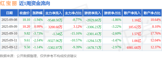 资金流向数据方面,本周红 宝 丽主力资金合计净流出3.44亿元,游资资金合计净流出1.06亿元,散户资金合计净流入4.5亿元。本周资金流向一览见下表: