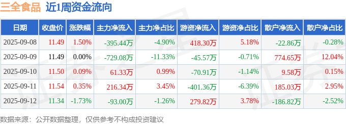 沪深股通持股方面,截止2025年9月12日收盘,三全食品深股通持股数为471.69万股,占流通股比为75.0%。