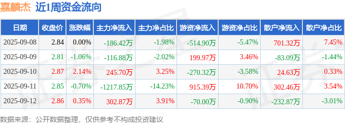 资金流向数据方面,本周嘉麟杰主力资金合计净流出972.59万元,游资资金合计净流入260.15万元,散户资金合计净流入712.44万元。本周资金流向一览见下表: