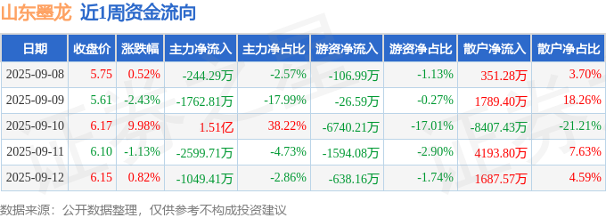 资金流向数据方面,本周山东墨龙主力资金合计净流入9491.42万元,游资资金合计净流出9106.03万元,散户资金合计净流出385.39万元。本周资金流向一览见下表: